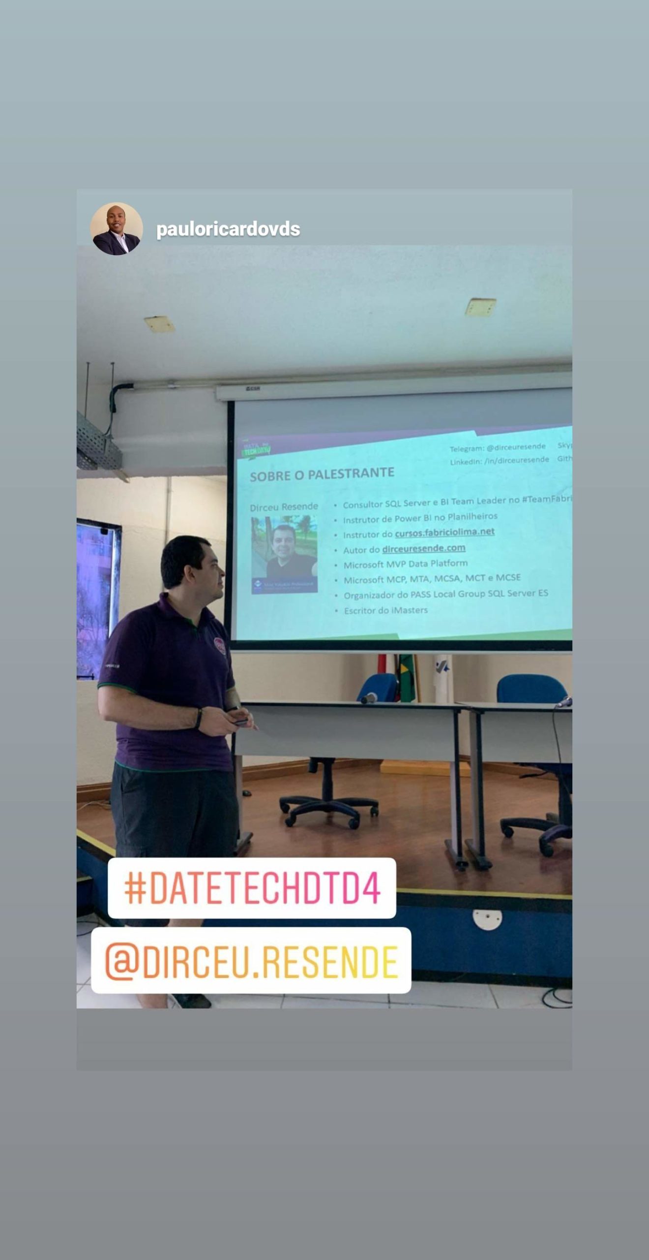Gostaria de agradecer o carinho de todos e o convite para participar do Data Tech Day 4 e se você é da região Norte do Brasil, participe mais dessa comunidade! Eles tem grupos no Whatsapp e Telegram que são ótimos para fazer networking com outros profissionais e empresas, ficar sabendo dos próximos eventos, enviar dúvidas e também ajudar nas dúvidas dos colegas.