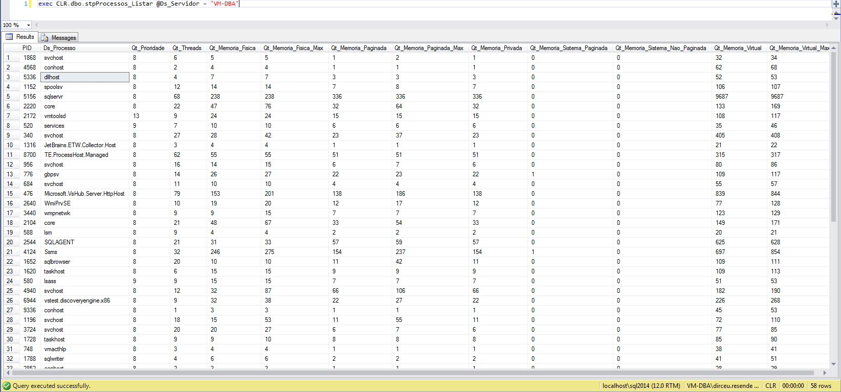 Na Stored Procedure abaixo, eu utilizo a biblioteca Process e o método GetProcesses para retornar as informações dos processos em execução no servidor em questão.