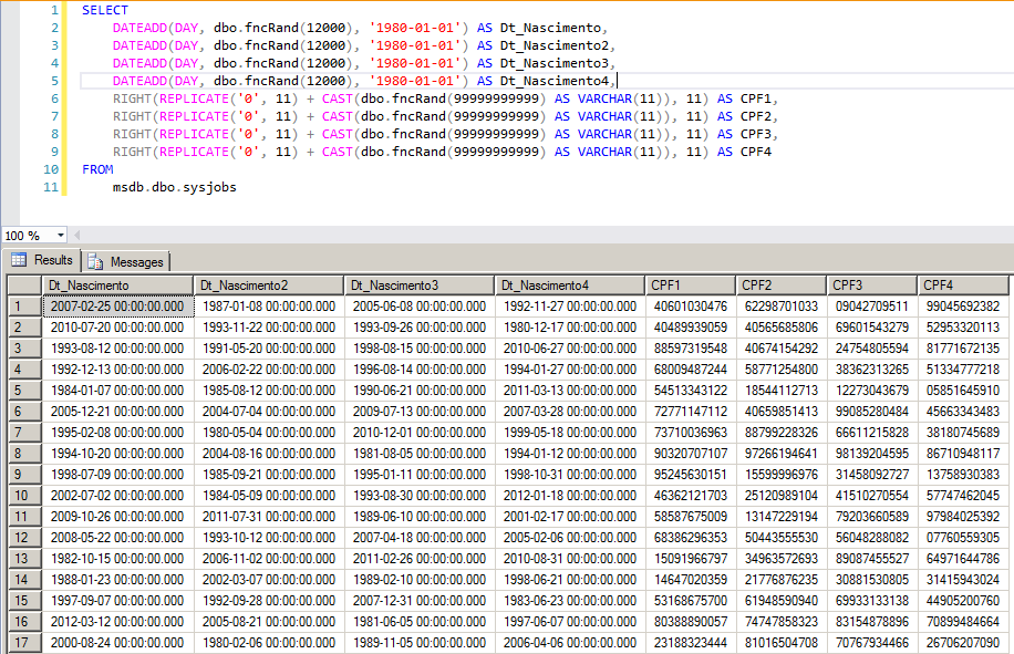 /* Cálculo da data: 1 a 12.000 dias após 01/01/1980 (+- 32 anos) Cálculo do CPF: Número aleatório entre 0 e 99999999999 */ SELECT DATEADD(DAY, dbo.fncRand(12000), '1980-01-01') AS Dt_Nascimento, DATEADD(DAY, dbo.fncRand(12000), '1980-01-01') AS Dt_Nascimento2, DATEADD(DAY, dbo.fncRand(12000), '1980-01-01') AS Dt_Nascimento3, DATEADD(DAY, dbo.fncRand(12000), '1980-01-01') AS Dt_Nascimento4, RIGHT(REPLICATE('0', 11) + CAST(dbo.fncRand(99999999999) AS VARCHAR(11)), 11) AS CPF1, RIGHT(REPLICATE('0', 11) + CAST(dbo.fncRand(99999999999) AS VARCHAR(11)), 11) AS CPF2, RIGHT(REPLICATE('0', 11) + CAST(dbo.fncRand(99999999999) AS VARCHAR(11)), 11) AS CPF3, RIGHT(REPLICATE('0', 11) + CAST(dbo.fncRand(99999999999) AS VARCHAR(11)), 11) AS CPF4 |