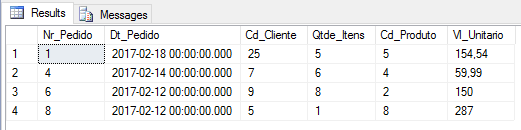 DECLARE @stringJson VARCHAR(MAX) = ' [ {"Pedido": 1, "Dt_Pedido": "18/02/2017", "Cd_Cliente": 25, "Qtde_Itens": 5, "Cd_Produto": 5, "Vl_Unitario": 154.54}, {"Pedido": 4, "Dt_Pedido": "14/02/2017", "Cd_Cliente": 7, "Qtde_Itens": 6, "Cd_Produto": 4, "Vl_Unitario": 59.99}, {"Pedido": 6, "Dt_Pedido": "12/02/2017", "Cd_Cliente": 9, "Qtde_Itens": 8, "Cd_Produto": 2, "Vl_Unitario": 150}, {"Pedido": 8, "Dt_Pedido": "12/02/2017", "Cd_Cliente": 5, "Qtde_Itens": 1, "Cd_Produto": 8, "Vl_Unitario": 287.00} ]' SELECT JsonImportado.Nr_Pedido , CONVERT(DATETIME, JsonImportado.Dt_Pedido, 103) AS Dt_Pedido, JsonImportado.Cd_Cliente , JsonImportado.Qtde_Itens , JsonImportado.Cd_Produto , JsonImportado.Vl_Unitario FROM OPENJSON(@stringJson) WITH ( Nr_Pedido INT '$.Pedido', Dt_Pedido NVARCHAR(10) '$.Dt_Pedido', Cd_Cliente INT '$.Cd_Cliente', Qtde_Itens INT '$.Qtde_Itens', Cd_Produto INT '$.Cd_Produto', Vl_Unitario FLOAT '$.Vl_Unitario' ) AS JsonImportado |