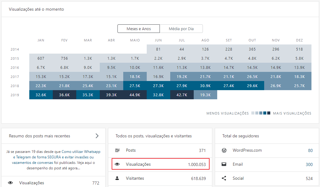 Em Maio de 2018, eu atingi a marca de 500 mil visualizações e hoje, 1 ano e 3 meses depois, consegui finalmente alcançar a marca de 1 milhão de visualizações no blog, com 372 artigos publicados e 618 mil pessoas impactadas pelos meus artigos!!