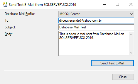Basta selecionar o perfil que você criou (No exemplo, é o MSSQLServer), preencher o e-mail do destinatário que irá receber o teste e clicar no botão “Send Test E-mail”