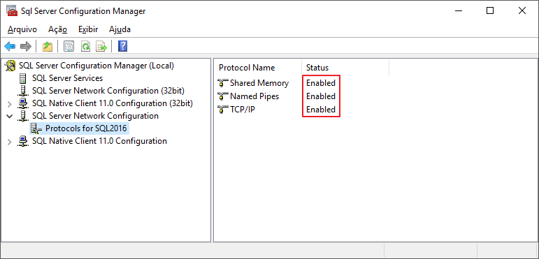 Uma outra validação que pode ser feita, é se os protocolos de rede Named Pipes e TCP/IP estão habilitados para a sua instância. Caso não estejam, habilite e reinicie o serviço do SQL Server da sua instância.