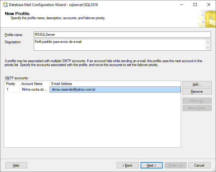 quando tento criar a conta de e-mail no final recebo a seguinte mensagem: Não é possível inserir o valor NULL na coluna “servername”. tabela ‘msdb.dbo.sysmail_server’