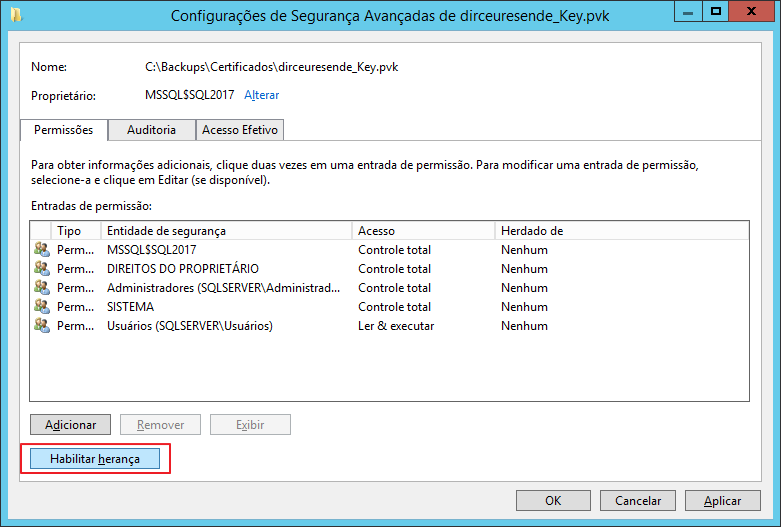 Caso você esteja se deparando com a mensagem de erro abaixo, você provavelmente vai precisar corrigir as permissões da master key e chave privada para habilitar a herança: