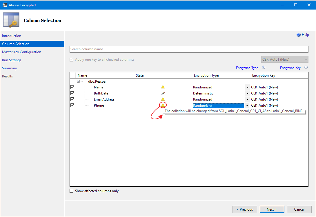 Como identificar quais colunas estão criptografas com Always Encrypted