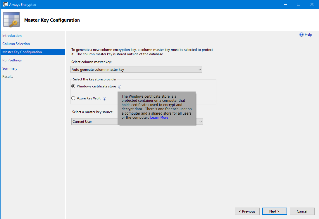 Vale lembrar que o usuário só poderá ver os dados originais se ele tiver as permissões de VIEW ANY COLUMN MASTER KEY DEFINITION e VIEW ANY COLUMN ENCRYPTION KEY DEFINITION ou se você estiver armazenando as Master Encryption Key e Column Encryption Key no servidor de banco (Windows Certification Store) e o certificado está armazenado na sua máquina ou no seu usuário. Caso você queira utilizar uma forma mais segura, opte pelo Azure Key Vault (AKV).