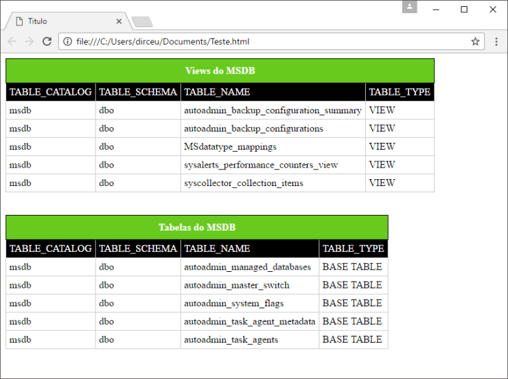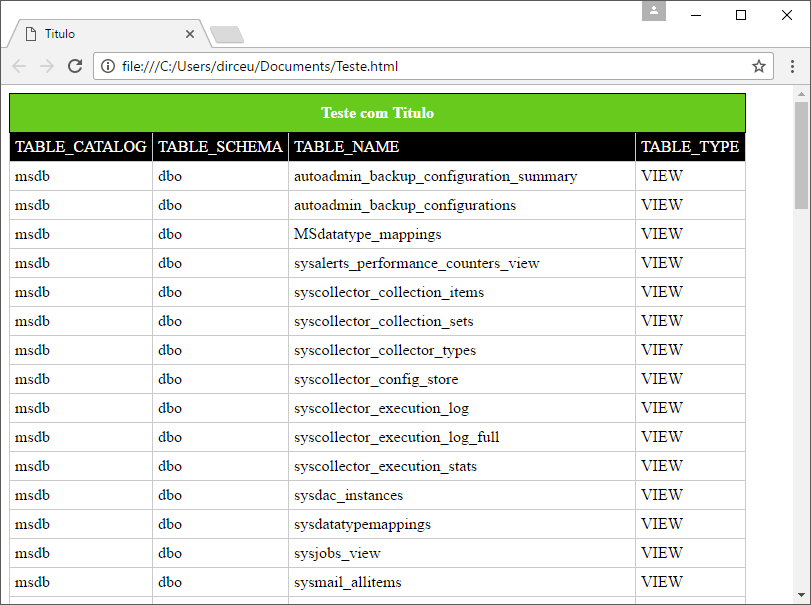 DECLARE @HTML VARCHAR(MAX), @Query VARCHAR(MAX) = 'SELECT * FROM msdb.INFORMATION_SCHEMA.TABLES WHERE TABLE_TYPE = ''VIEW'' ORDER BY TABLE_NAME' SET @HTML = CLR.dbo.fncExporta_Query_HTML(@Query, 'Teste com Titulo', 1, 1) PRINT @HTML |