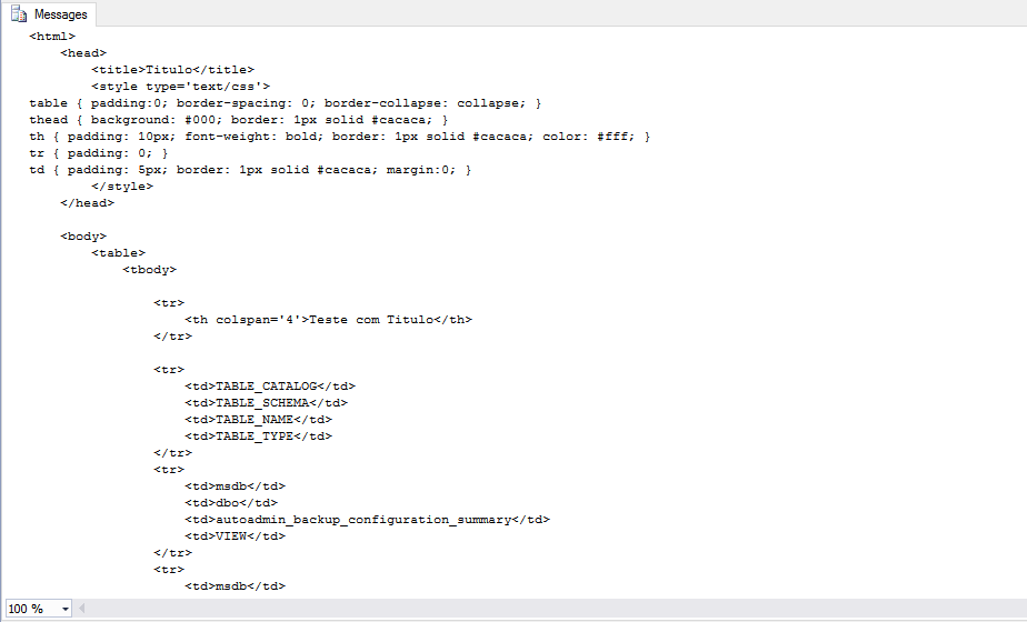 DECLARE @HTML VARCHAR(MAX), @Query VARCHAR(MAX) = 'SELECT * FROM msdb.INFORMATION_SCHEMA.TABLES WHERE TABLE_TYPE = ''VIEW'' ORDER BY TABLE_NAME' SET @HTML = CLR.dbo.fncExporta_Query_HTML(@Query, 'Teste com Titulo', 2, 1) EXEC CLR.dbo.stpEscreve_Arquivo @Ds_Texto = @HTML, -- nvarchar(max) @Ds_Caminho = N'C:\Users\dirceu\Documents\Teste.html', -- nvarchar(max) @Ds_Codificacao = N'UTF-8', -- nvarchar(max) @Ds_Formato_Quebra_Linha = N'windows', -- nvarchar(max) @Fl_Append = 0 -- bit |