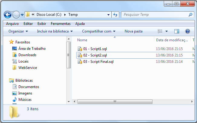 Crie um arquivo .BAT no diretório dos seus scripts (Neste exemplo, vou usar o nome “Executa Scripts.bat”) com o seguinte comando: