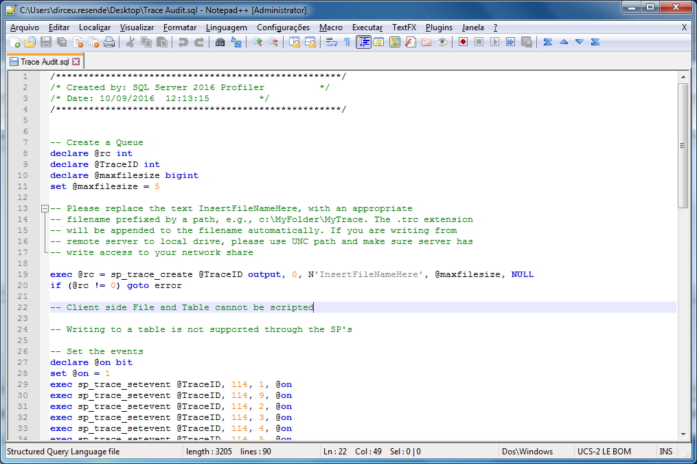 E esse será o resultado da exportação do Trace como script SQL: